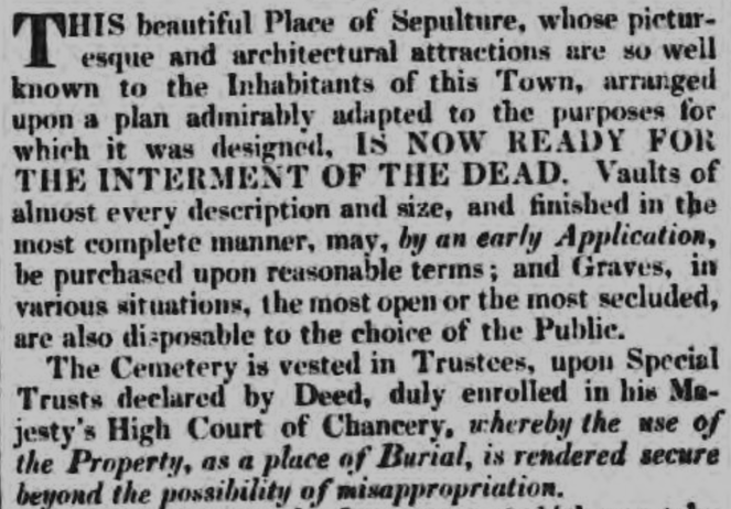 However, despite the site’s prominent location and beautiful landscaping, it took about six years for the first thousand burials to take place at the General Cemetery. By the end of 1839 just 499 burials had taken place there. Perhaps the cost of burial there was off-putting to some; others may have worried that its relatively isolated location might make it an easy target for bodysnatchers. No doubt other local families did not wish to bury their loved ones in a burial ground set aside for nonconformists, without the consecrated ground sought out by Catholics and Anglicans.