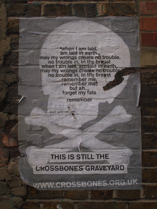 Thanks to its modern transformation and status as the inspiration for the Southwark Mysteries, Cross Bones surely rates as one of London’s most unusual former burial grounds. Its colourful decorations and commitment to remembering the poor and the outcasts draw visitors from all over the world – on the afternoon that I visited to take the photographs for this article, some Australian tourists were among those who had taken the time to visit. The myths and legends that have endured about Cross Bones give it a rare mystique that continues to draw interest, but most of all it serves as a poignant reminder that a huge proportion of Londoners never had a grand grave marked by a fancy headstone, but disappeared instead into unmarked paupers’ graves.