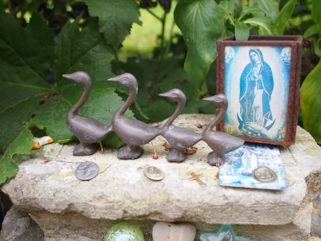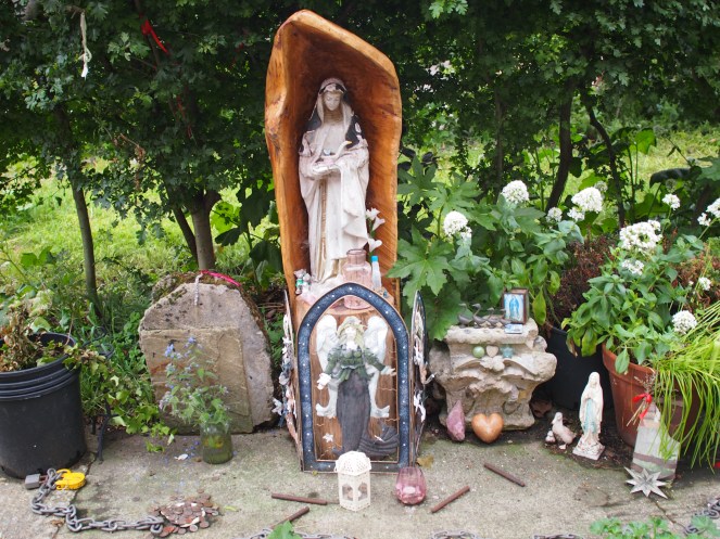 The concrete that has covered the burial ground has been broken up in places, and incorporated into the landscaping, accompanied by trinkets, statues and other objects left by well-wishers.