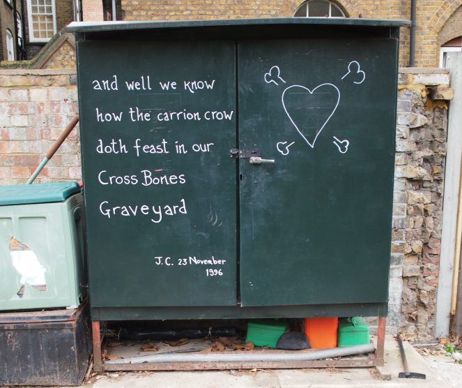 Cross Bones is one of the stops on “Southwark’s Lost Burial Grounds,” the guided tour I carry out on behalf of Southwark Cathedral. Please check the Events page for any scheduled tour dates and ticket information.