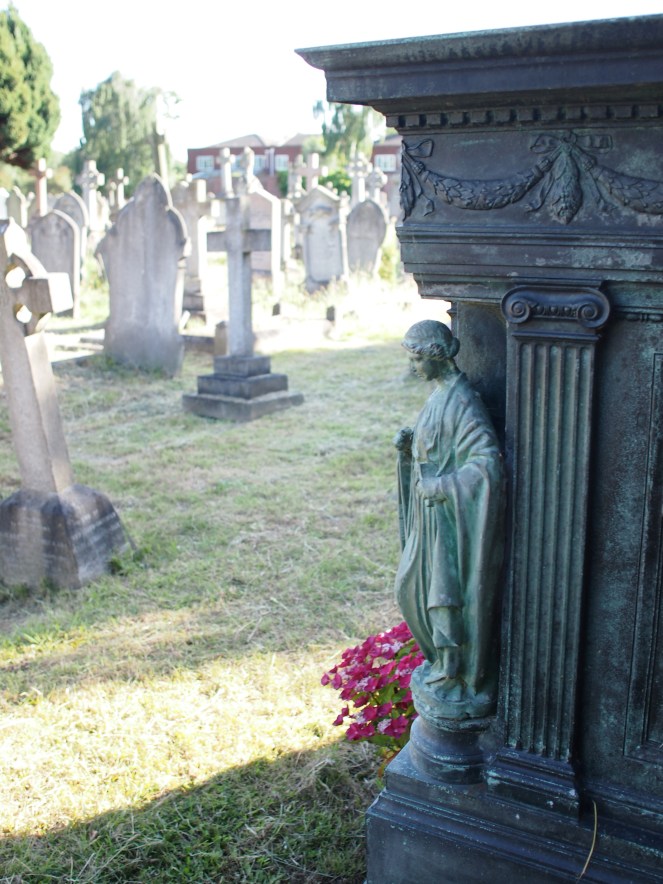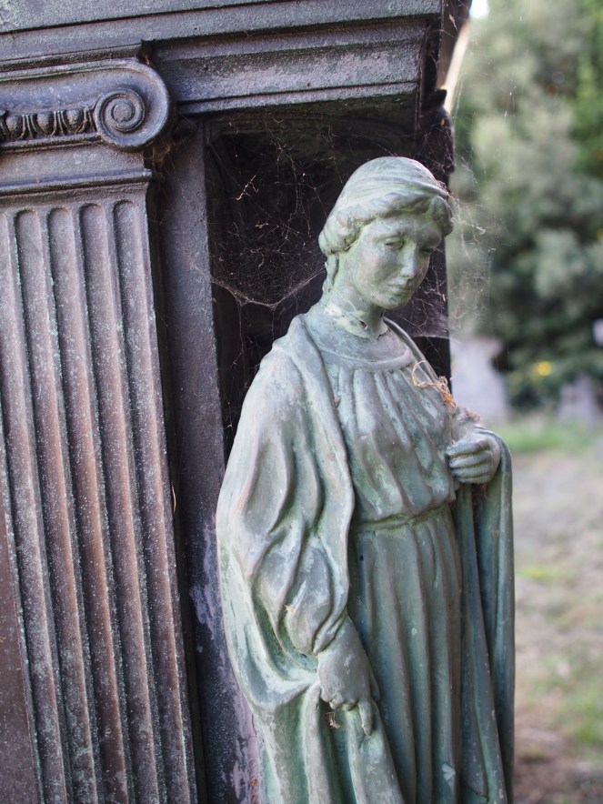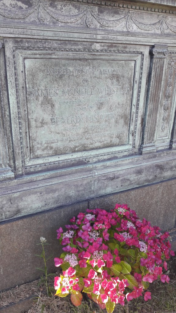 The beautiful figures which adorn each corner of the Whistler tomb are sadly not the originals that were sculpted by Edward.  These were stolen, and in 1993 a campaign was launched to raise money to fund the creation of replicas so that the tomb could be restored to its former glory.  Today, the tomb is a little cobwebby, but is in a well-kept corner of the cemetery. A pot of pink flowers had been laid at the grave, possibly by a family member or well-wisher. Discovering this grave led me down a fascinating rabbit hole: it was wonderful to learn about Beatrice’s life, career, and artwork in the overwhelmingly male art world of the late nineteenth century, and I hope that by telling her story here that this wonderful tomb’s second, overlooked occupant will find a little limelight once again.
