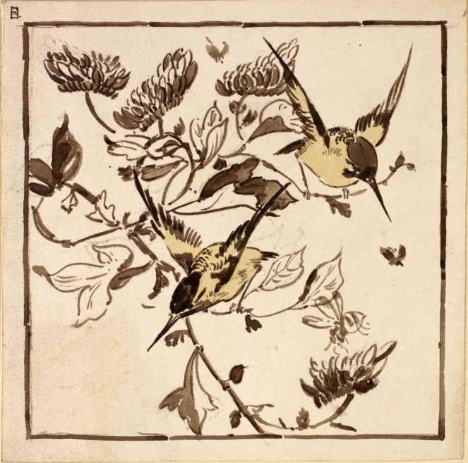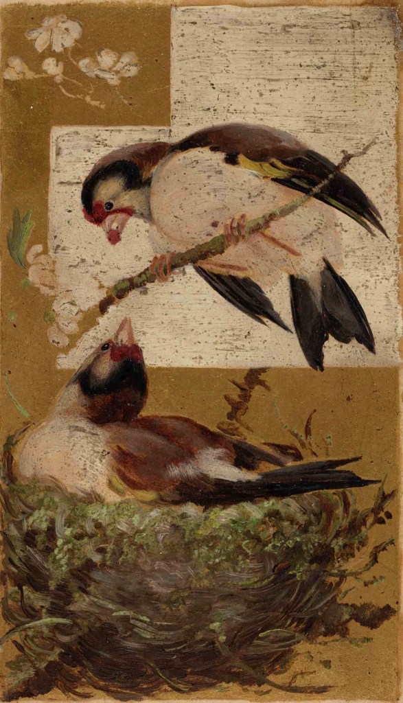 John and his wife Frances Black had ten children – Beatrice, born in 1857, was their eldest daughter.  The family lived in Chelsea, famously a home to many artists and creatives in the Victorian period.  Beatrice studied art in her father’s studio, and later became a designer in the office of the architect-designer Edward Godwin, a friend of her father’s.  Edward Godwin was an important figure in architecture and design in the mid-Victorian period, incorporating Japanese art and design into some of his work, and later acting as an influencer of the Aesthetic and Arts and Crafts movements.  As well as designing buildings, Godwin also created designs for furniture and wall coverings, many of which were then sold at Liberty of London.  Beatrice, working as one of his designers, may well have been involved in the creation of many of these designs, and certainly throughout her career she produced many images – such as these drawings of finches – that were then used for decorative furniture panels, tiles and wallpaper designs.  Many of Beatrice’s drawings and designs feature birds; she kept pet birds at home and enjoyed observing and drawing them.