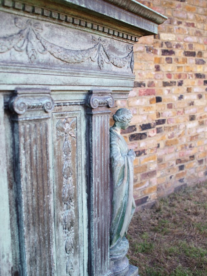 The copper coating of the tomb has turned green over time – this may have been the intention of the designer.  It has classical-style columns and is adorned with swags and floral patterns, the latter perhaps reflecting some of the artistic work done by the people it commemorates.  The inscription beneath James and Beatrice’s names (“The place where I also at last hope to be hidden / for in no other would I be“) is taken from a November 1897 letter from Whistler, who had returned to Paris, to his friend Ethel Whibley, who had recently visited Beatrice’s grave in Chiswick: